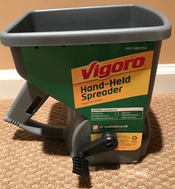 For drop spreaders go with a setting of 5 for overseeding and a bare lawn setting of 6 3 4. For application with a handheld broadcast spreader use a setting of 3 when overseeding and 4 when planting a bare lawn. Designed for 4 season use with vigoro seed fertilizer and ice melt product. The label calls for 3 to 7 pounds per 1000 square feet.